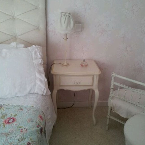 La mesilla Provencale aporta un toque de elegancia clásica al dormitorio. Preciosa la pantalla textil Daphne